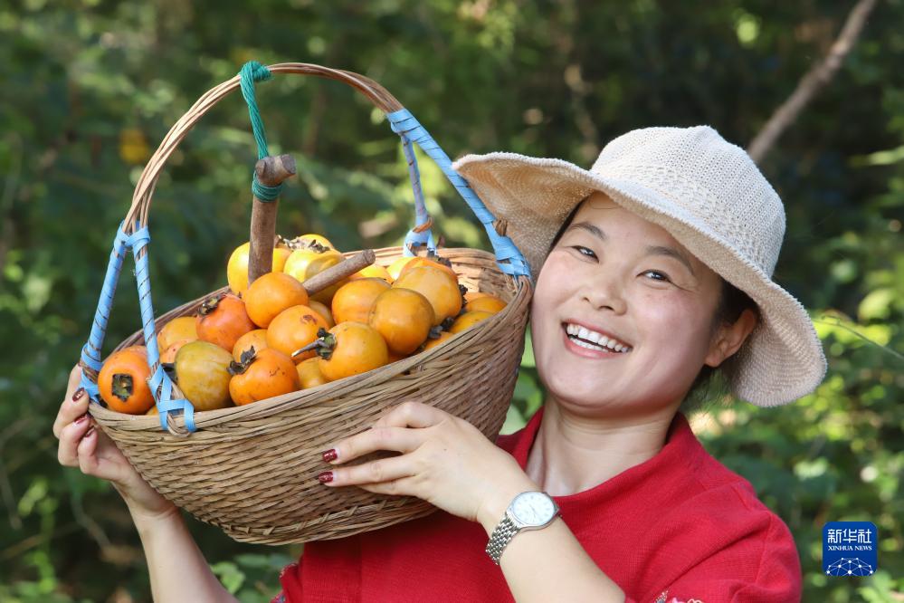 10月24日,在浙江省台州市路桥区峰江街道白枫岙村,村民展示采摘的柿子。