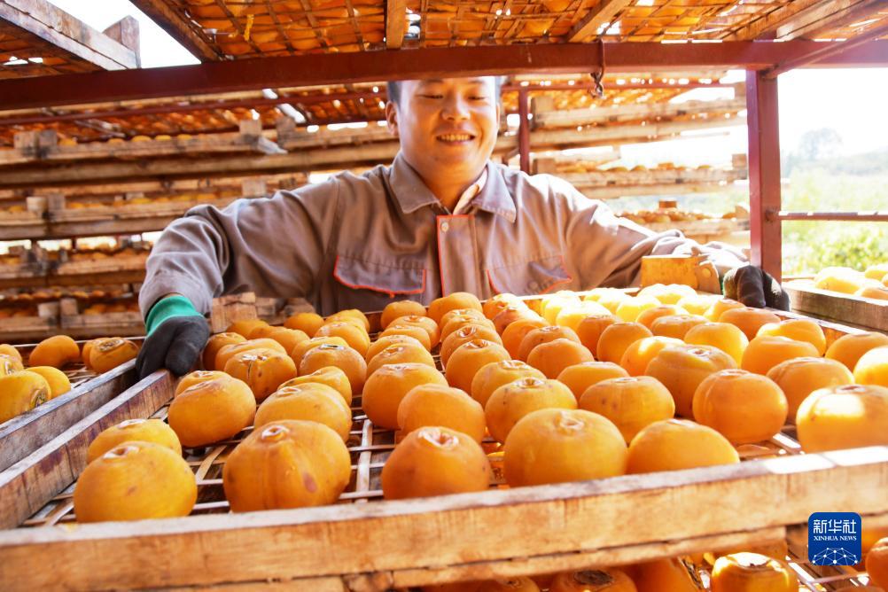 10月15日,广西桂林市恭城瑶族自治县嘉会镇秧家村柿农在晾晒柿子。