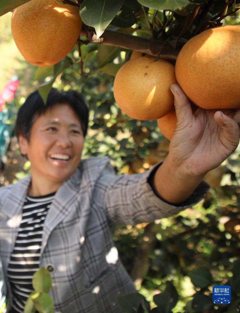 10月9日,在河北省邯郸市广平县平固店镇南下堡村晚秋黄梨种植基地,农户在采摘成熟的晚秋黄梨。