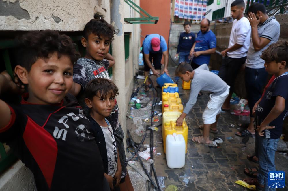 10月26日,人们在加沙地带南部城市汗尤尼斯街头打水。