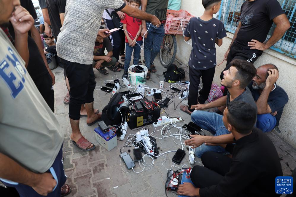 10月25日,在加沙地带南部城市汗尤尼斯,人们在街头给手机充电。