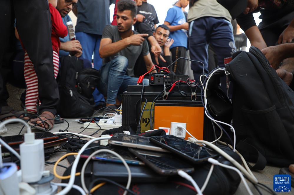 10月25日,在加沙地带南部城市汗尤尼斯,人们在街头给手机充电。