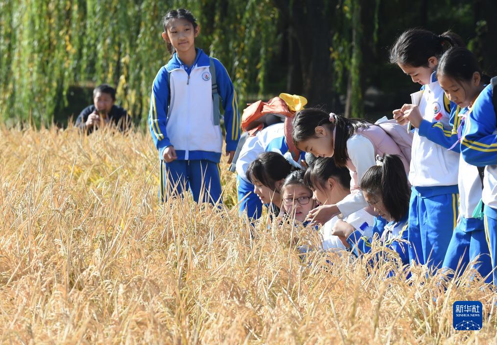 10月27日,来自中国农业科学院附属小学的学生在圆明园“多稼如云”景区的稻田边观察稻谷。