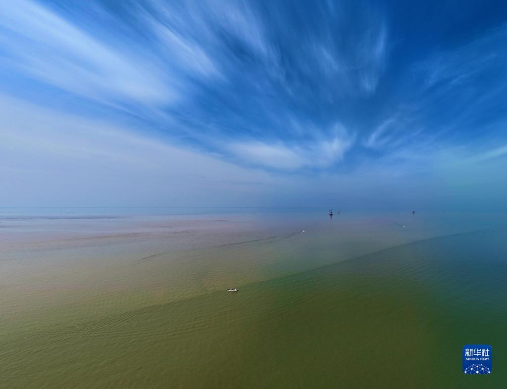 2023年10月12日在山东省东营市拍摄的黄河水和海水交界的场景(无人机照片)。