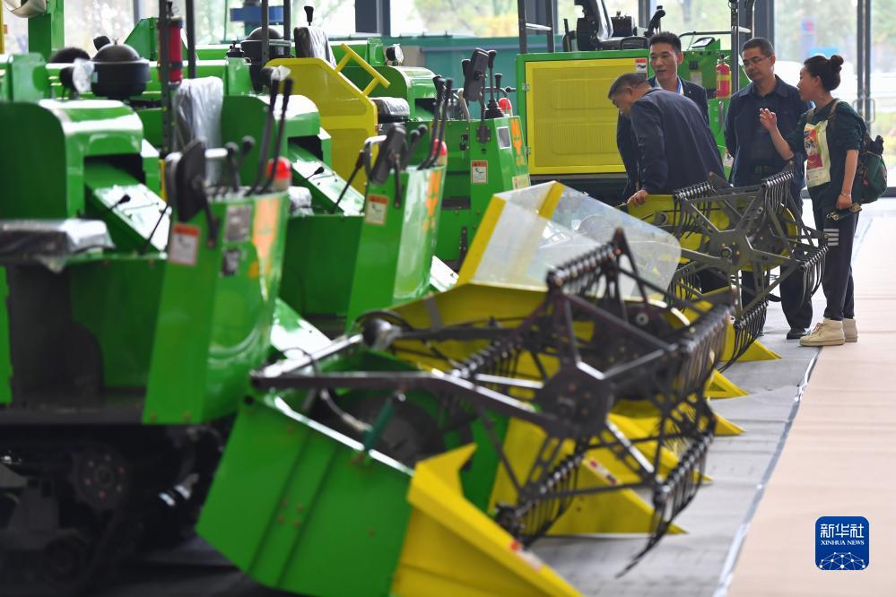 10月27日,在长沙国际会展中心举办的农博会现场,参观者在了解收割机。