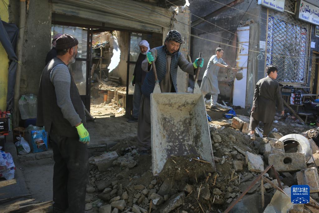 10月27日,在阿富汗首都喀布尔,人们在爆炸事件后清理砖瓦。
