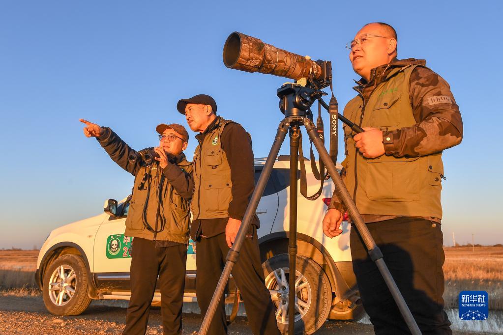 10月26日,中国野生动物保护协会吉林白城护飞队队员王岩(左)、张惠超(中)和姜海涛观察、拍摄候鸟。