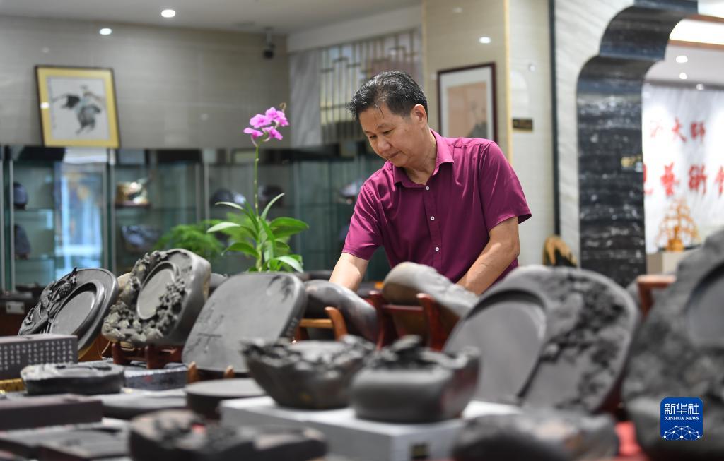 10月26日,在广东肇庆柳新祥端砚艺术馆,柳新祥在布置端砚作品。