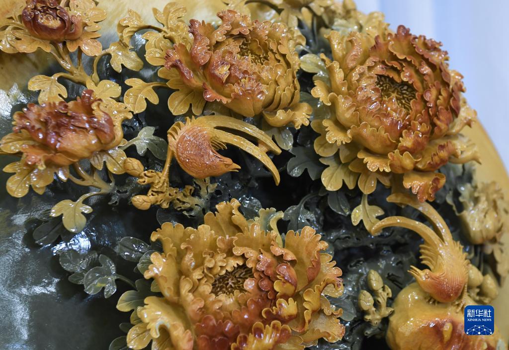 这是10月25日拍摄的柳新祥端砚作品绿端“国色天香砚”的局部。