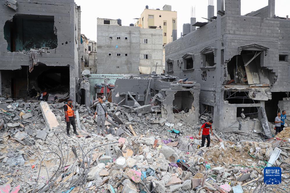 10月27日,在加沙地带南部城市汗尤尼斯,人们查看建筑废墟。