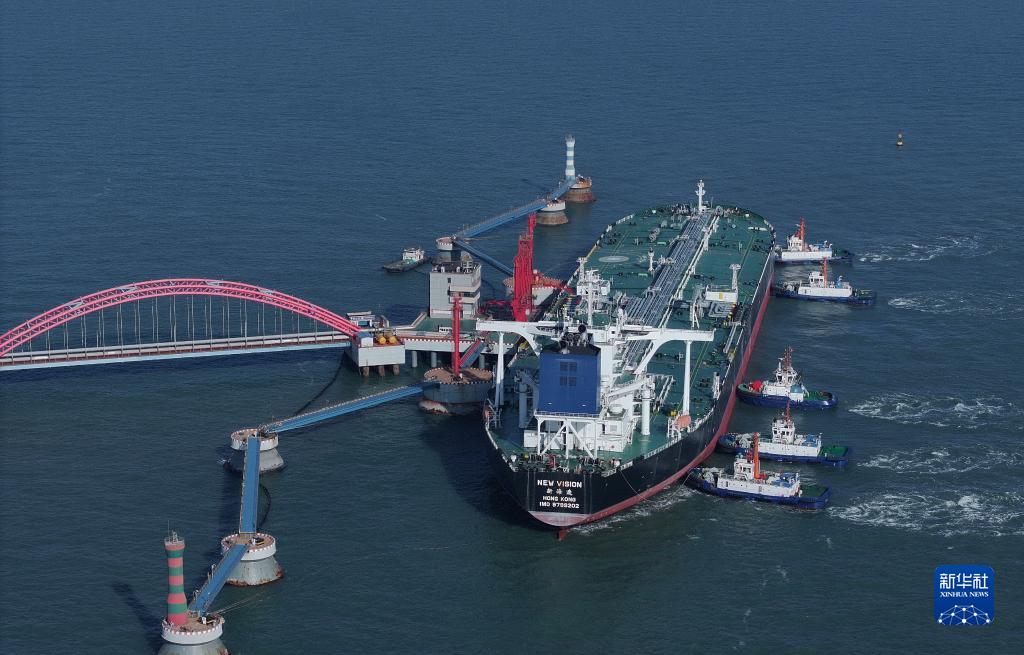10月27日,一艘LNG船在拖轮的协助下向唐山港曹妃甸港区LNG码头靠泊(无人机照片)。
