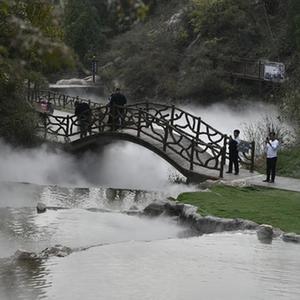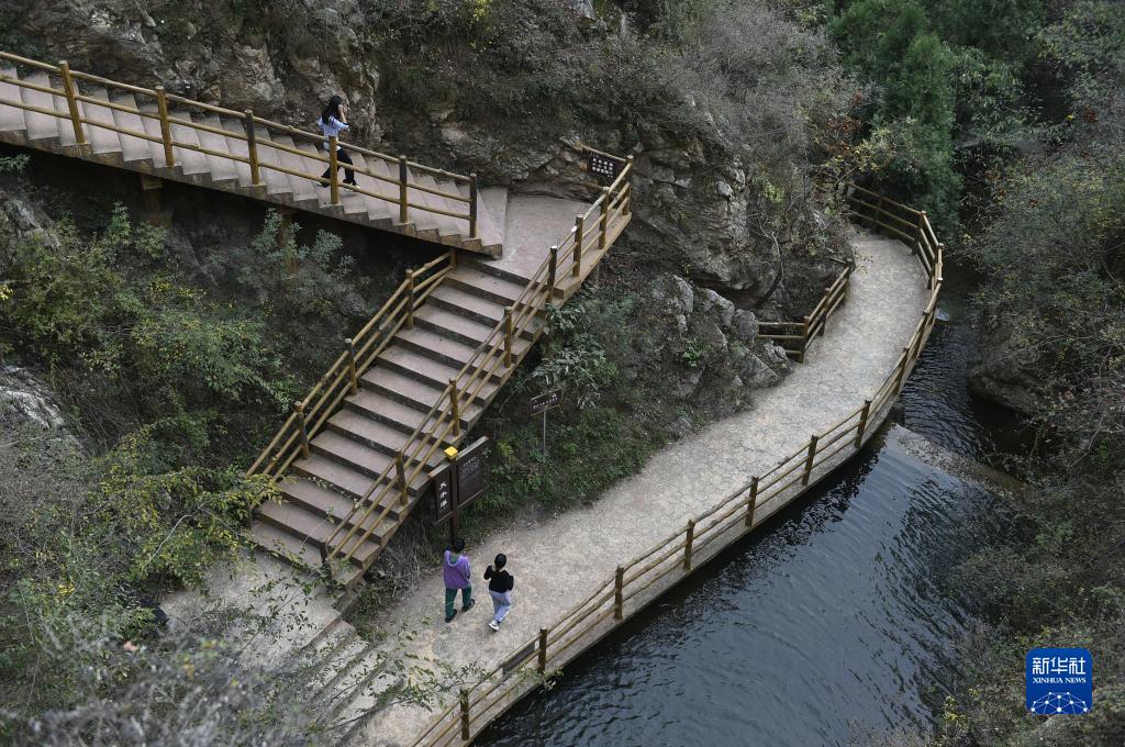 霜降节气过后,位于河南省禹州市鸠山镇的大鸿寨国家森林公园层林尽染,景色宜人,吸引游客前来登高观景、赏秋拍照。