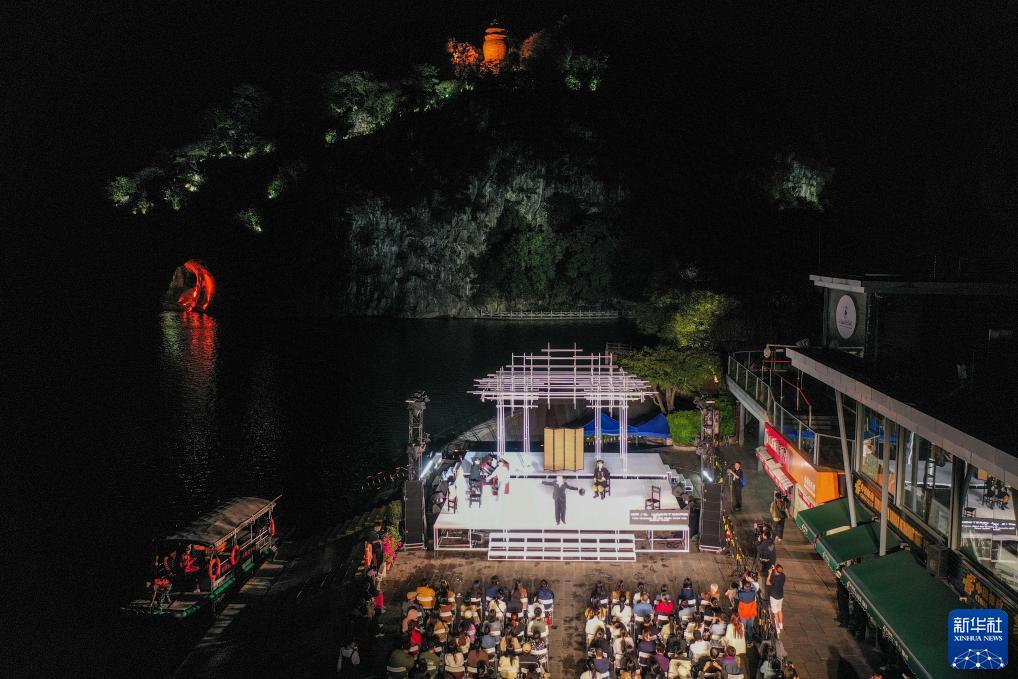 10月27日晚,在广西桂林市象山公园,演员们在表演歌剧(无人机照片)。