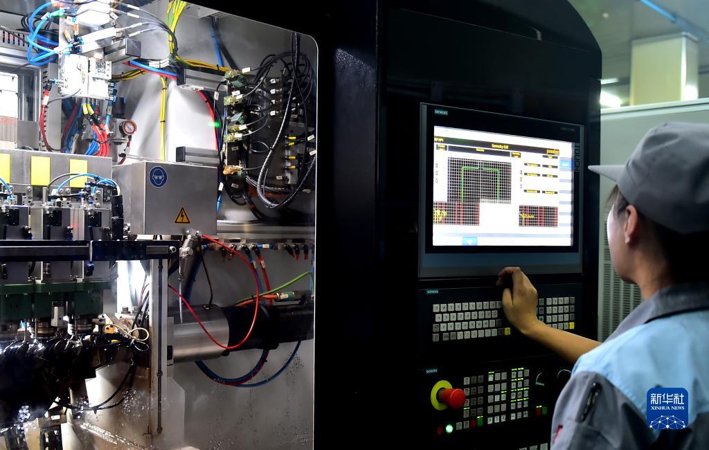 10月26日,在山东省聊城市高新区山东鑫亚格林鲍尔燃油系统有限公司生产车间,技术人员在生产线上操作设备。