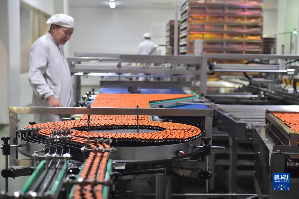 10月27日,工人在山东省聊城市东阿县东阿阿胶股份有限公司阿胶世界体验工厂阿胶浆生产线上值守。