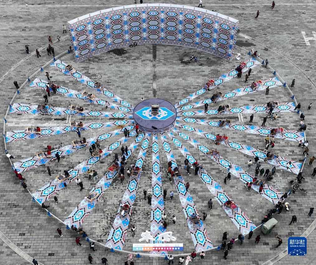 当日,数十名织锦女工在湖北省来凤县龙凤文化中心广场现场进行“西兰卡普”制作,普及非遗文化。