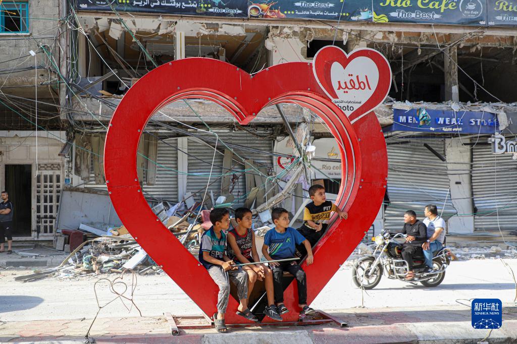 10月22日,在加沙地带南部城市汗尤尼斯,几名儿童坐在一处心形设施上。