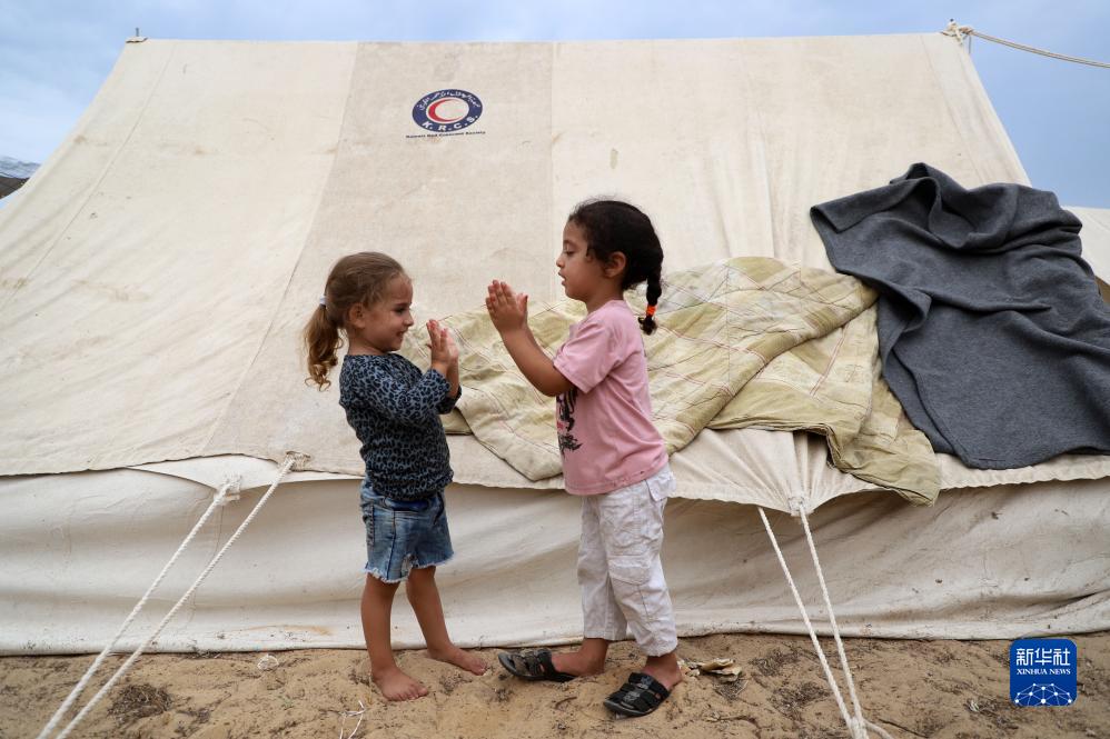 这是10月27日在加沙地带南部城市汗尤尼斯一处临时营地内拍摄的巴勒斯坦儿童。
