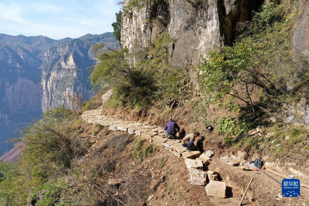 在壶关县大峡谷镇青龙峡村,村民们在山上修路(10月17日摄,无人机照片)。