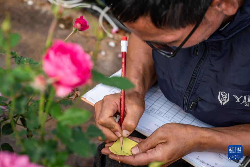 在云南省安宁市现代农业园区玫瑰种植示范园,技术员田连通记录玫瑰花编号(10月20日摄)。