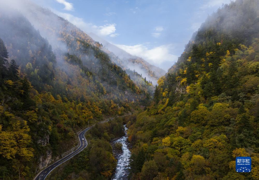 前往党岭村的乡村旅游公路蜿蜒在高山峡谷中(10月27日摄,无人机照片)。