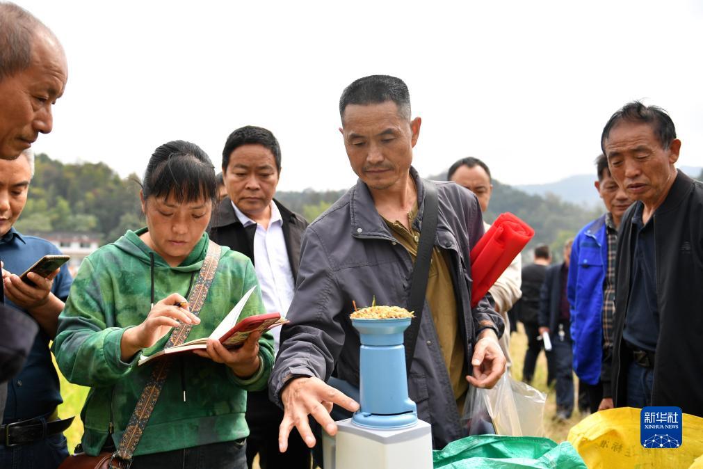 10月28日,在位于娄底市双峰县永丰街道松坪村的“稻再油”示范片,工作人员检测再生季稻谷含水量。