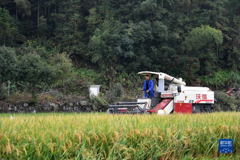10月28日,在位于娄底市双峰县永丰街道松坪村的“稻再油”示范片,农机手驾驶收割机收割再生季稻谷。