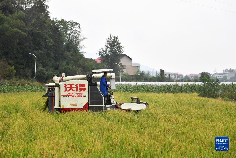 10月28日,在位于娄底市双峰县永丰街道松坪村的“稻再油”示范片,农机手驾驶收割机收割再生季稻谷。