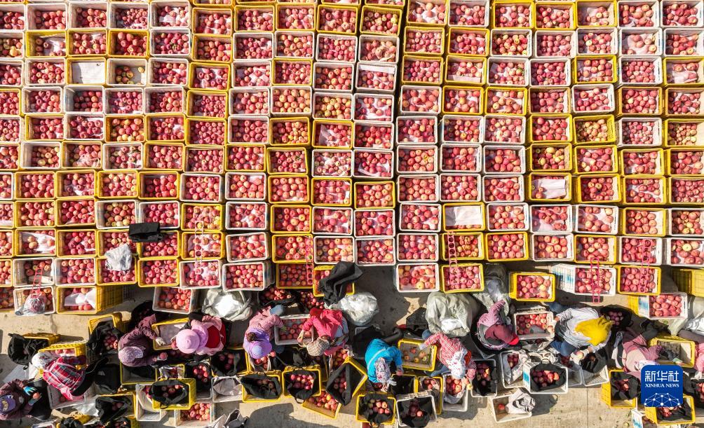 10月28日,在山东省荣成市夏庄镇一处苹果园,果农们在分拣、装运苹果(无人机照片)。