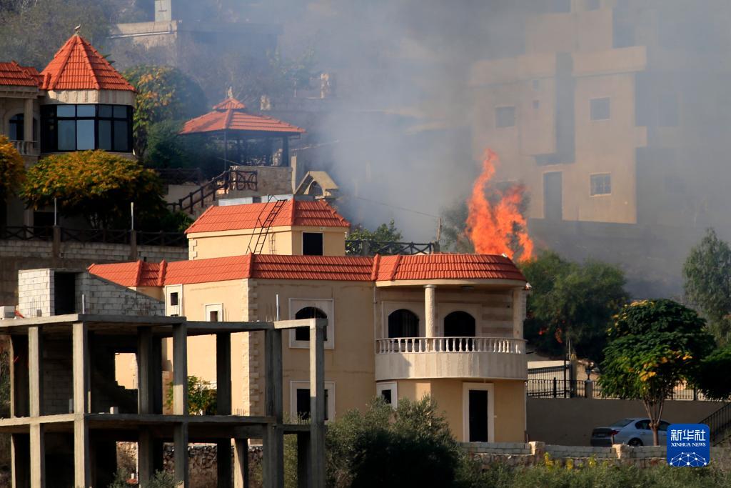 10月28日,在黎巴嫩迈斯杰贝勒,一处居民区遭炮击后起火。