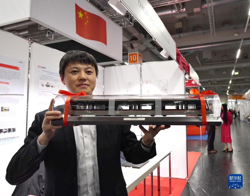 10月28日,在德国纽伦堡,中车株洲电力机车研究所有限公司工作人员展示一款智能轨道快运列车模型。智能轨道快运系统无需铺设物理轨道,地面画有白色虚拟轨道,车辆借助轨迹跟随等技术行驶。