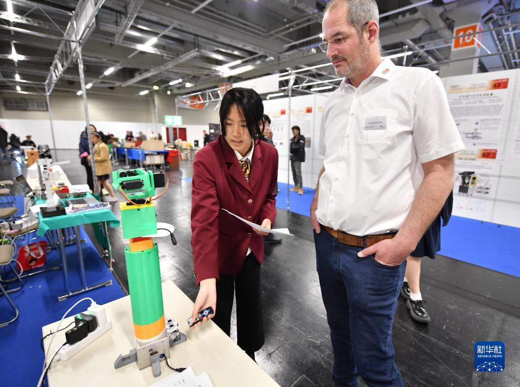 10月28日,在德国纽伦堡,一名北京市第八十中学的学生向参观者介绍一款自稳定三脚架模型。