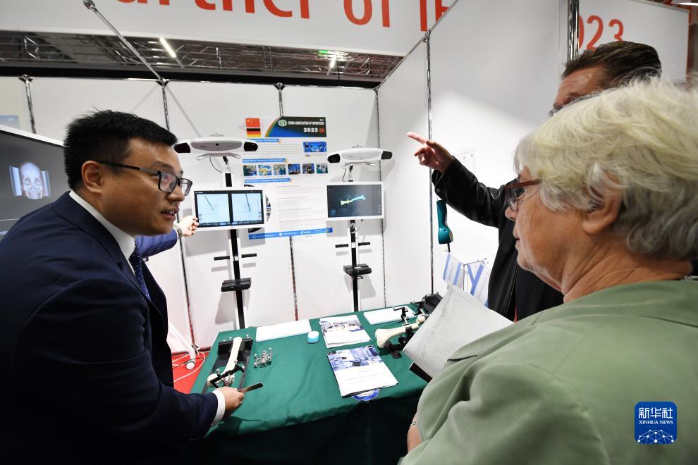 10月28日,在德国纽伦堡,国家骨科与运动康复临床医学研究中心的工作人员(左)向参观者介绍一款智能手术导航系统。