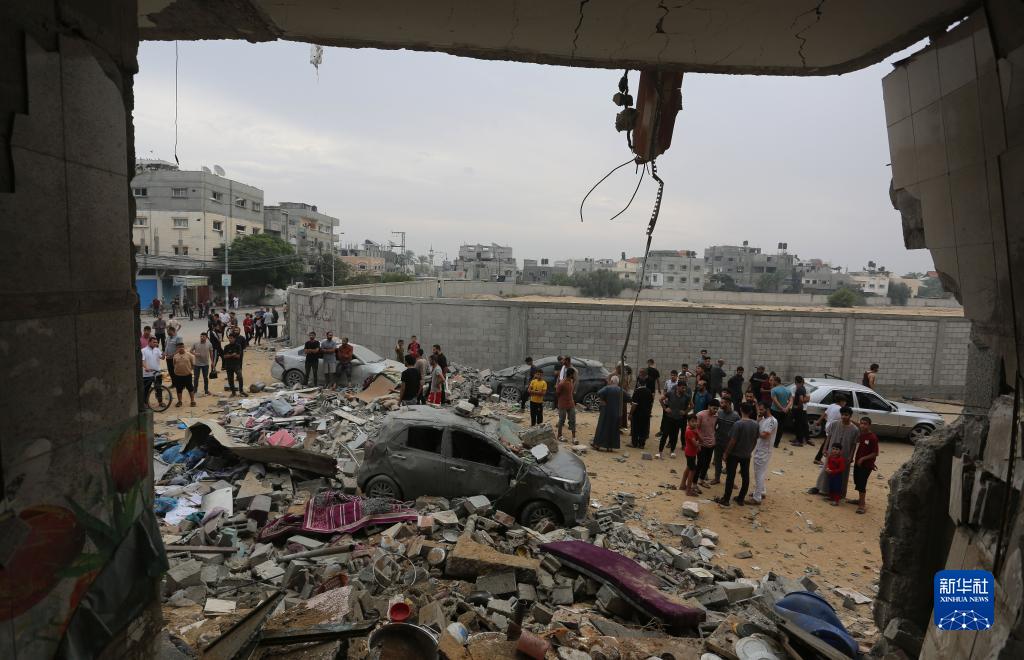 10月29日,在加沙地带南部城市拉法,人们聚集在被以军空袭损毁的建筑附近。