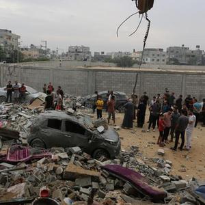 10月29日,在加沙地带南部城市拉法,人们聚集在被以军空袭损毁的建筑附近。