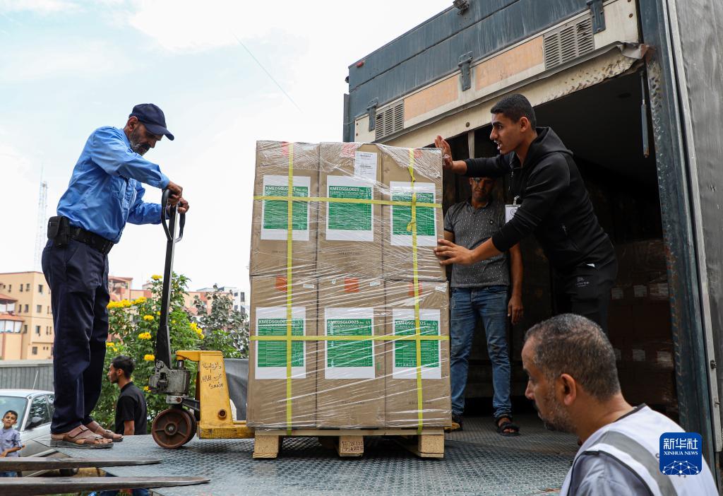 10月29日,工作人员在加沙地带南部城市汗尤尼斯的一家医院搬运医疗援助物资。