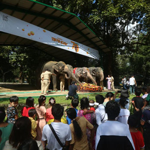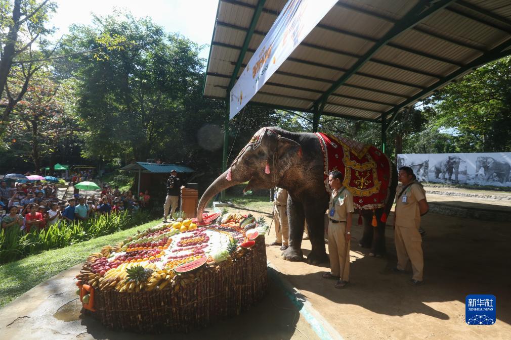 当日,雌性大象莫莫在缅甸仰光动物园品尝由水果和蔬菜制成的蛋糕,庆祝70岁生日。新华社发(苗觉梭摄)