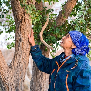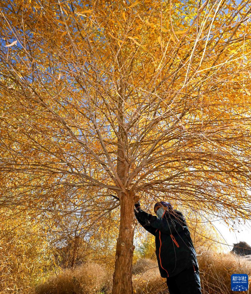 10月28日,德力格为胡杨树修枝。