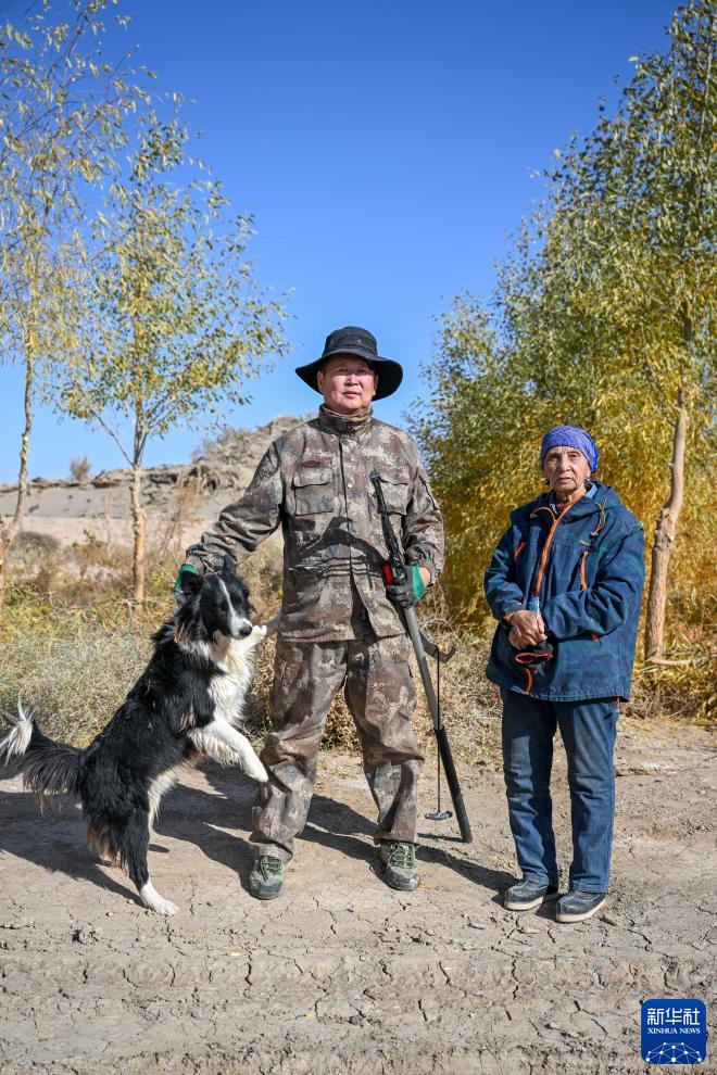 10月28日,德力格(右)和儿子苏虎庆在修剪完的胡杨树旁合影。