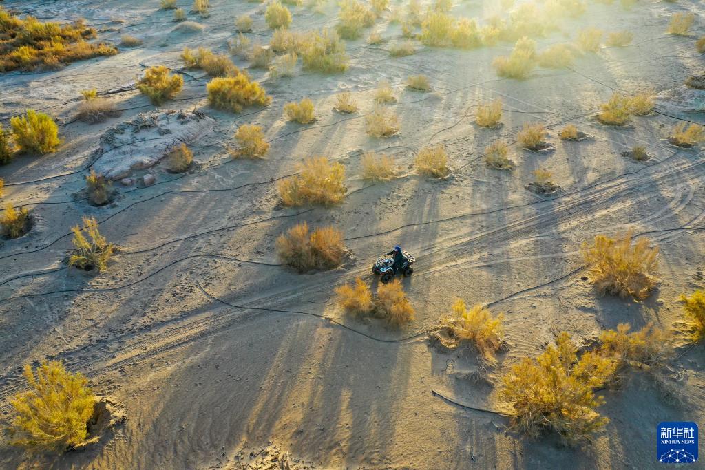 德力格在巡护梭梭林(无人机照片,10月27日摄)。