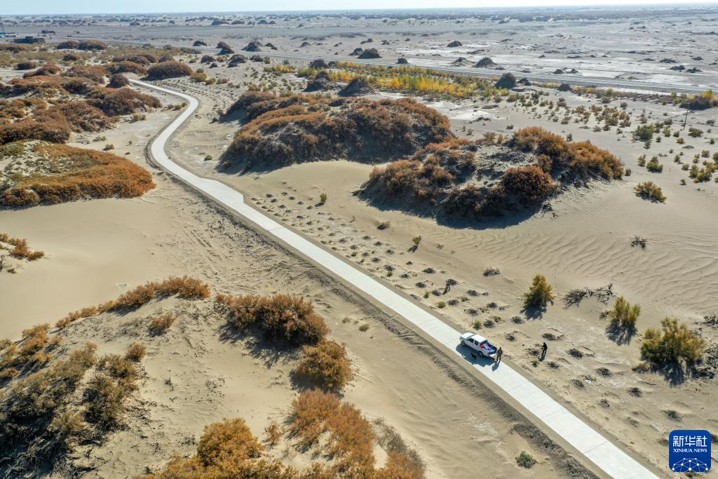 德力格给梭梭树浇水(无人机照片,10月28日摄)。