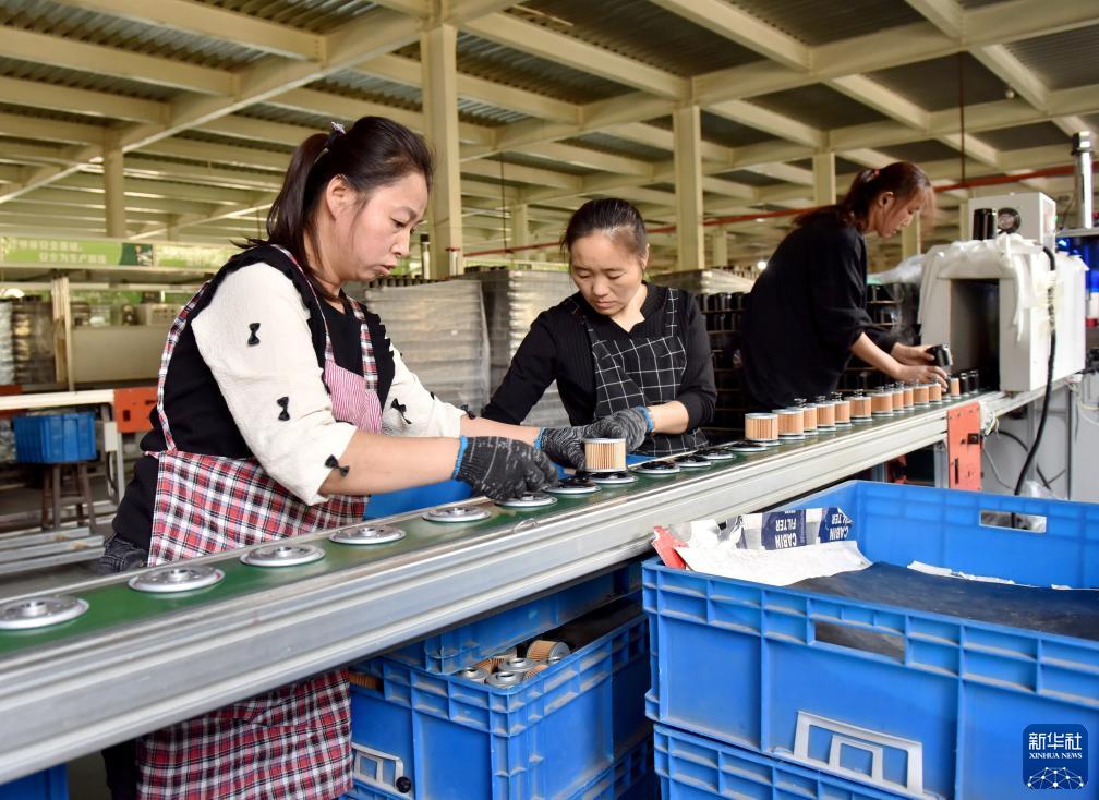 10月30日,威县一家汽车滤芯生产企业工人在生产线上组装滤芯。
