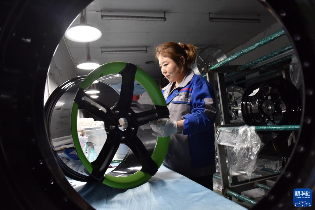 10月30日,威县一家汽车轮毂生产企业工人在对轮毂进行质检。