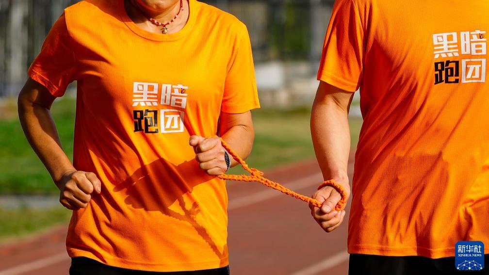 在四川大学华西校区运动场,“黑暗跑团”志愿者许福婵(左)用陪跑绳带着视障跑者吴小华训练(10月28日摄)。新华社记者 沈伯韩 摄