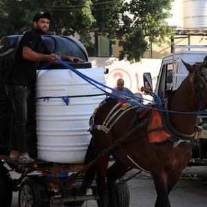 10月30日,因缺乏燃料,人们在加沙地带南部城市汗尤尼斯使用畜力车运输饮用水。