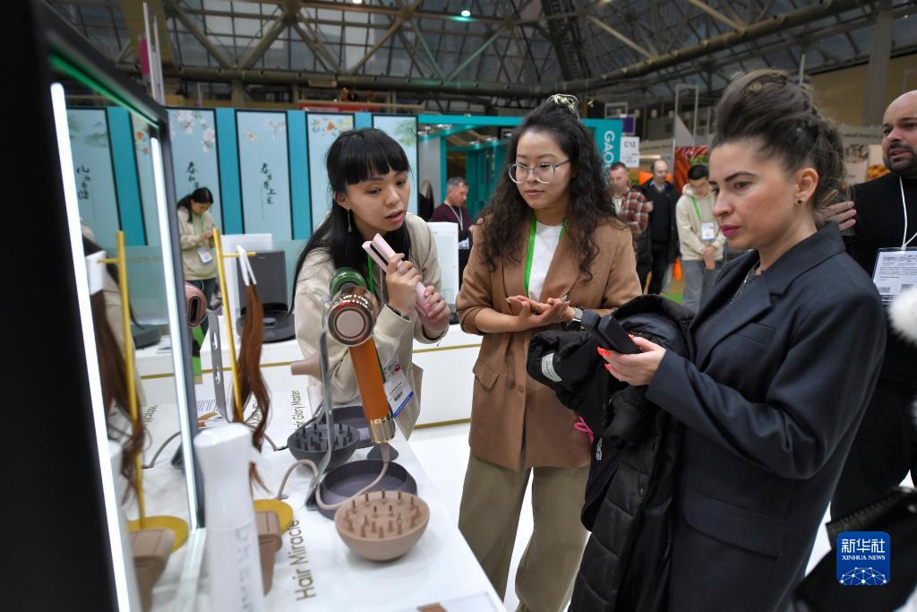 10月30日,在俄罗斯首都莫斯科,人们在中国消费品(俄罗斯)品牌展览会上查看展出的美发用品。