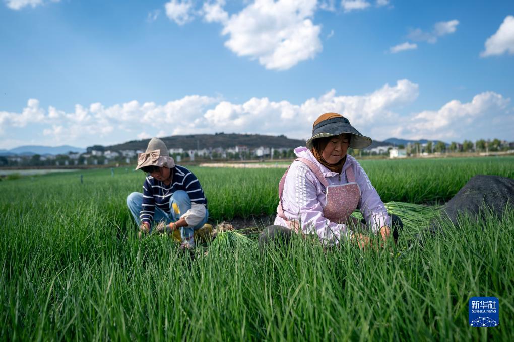 10月30日,农民在鲁甸县一处香葱种植基地内采收香葱。