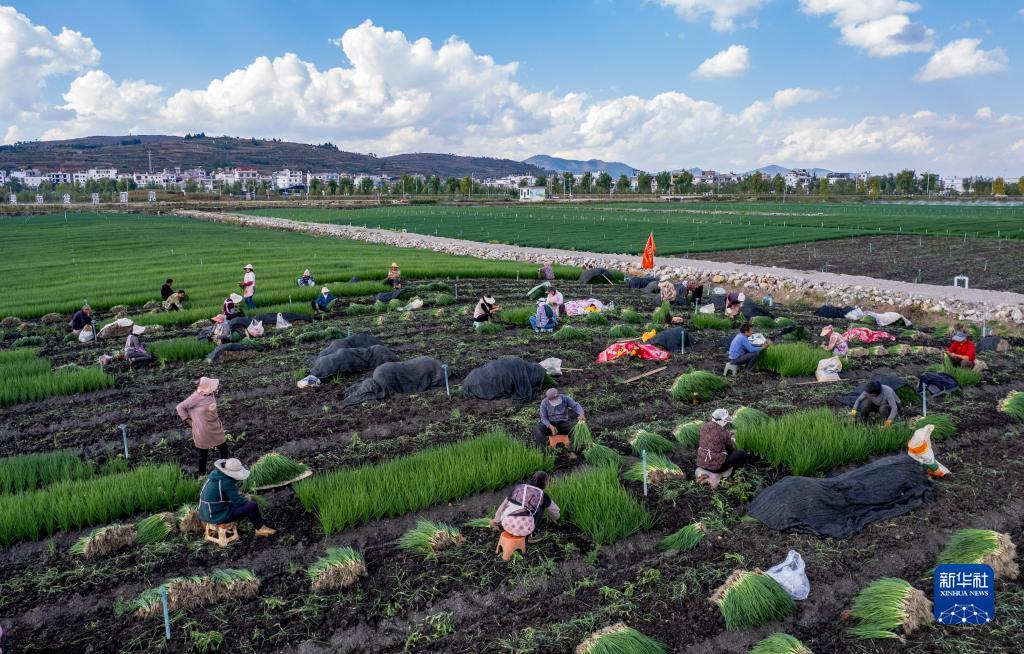 10月30日,农民在鲁甸县一处香葱种植基地内工作(无人机照片)。