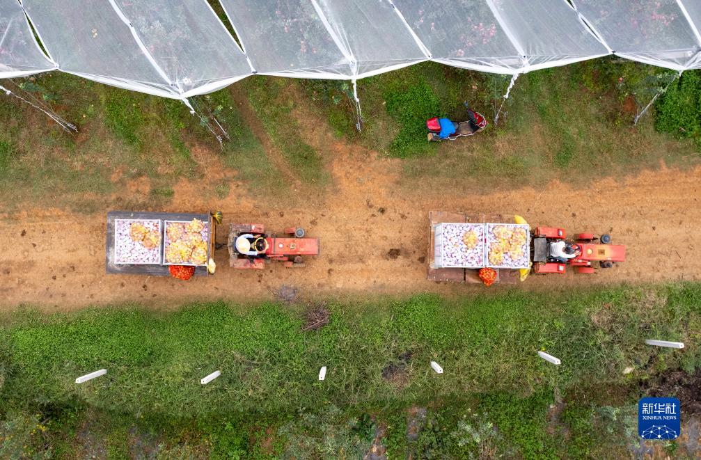 10月30日,果农在昭通市一处苹果基地内运送苹果(无人机照片)。