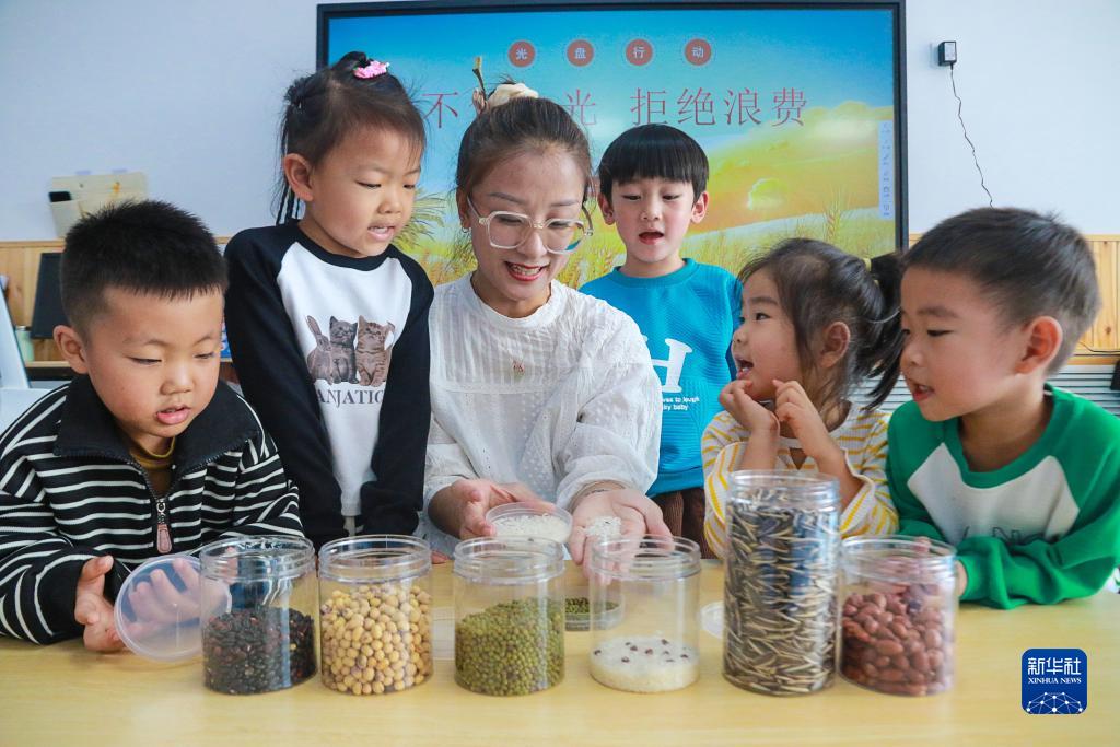 10月31日,在山东省高密市凤鸣实验幼儿园,孩子们在老师指导下认识粮食。
